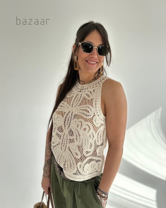 Jej subtelny, ażurowy splot w odcieniu perłowego beżu nadaje stylizacji wyjątkowej lekkości i unikalnego, kobiecego charakteru. To idealna, strukturalna warstwa, którą możesz nosić na gładki top, tworząc modne i przewiewne zestawy, lub połączyć ze spódnicą lub szortami, aby podkreślić letnią elegancję.