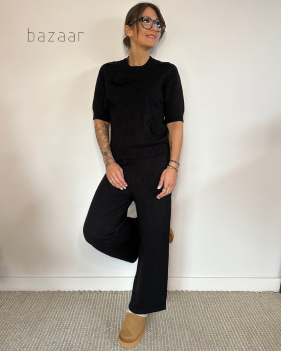 Odkryj idealną równowagę między elegancją a domowym komfortem dzięki temu stylowemu, czarnemu kompletowi dzianinowemu. Wykonany z niezwykle miękkiej i elastycznej przędzy, zestaw ten delikatnie otula sylwetkę, zapewniając pełną swobodę ruchów i przyjemne ciepło. Bluzka z krótkim rękawem przyciąga wzrok modnymi, trójwymiarowymi aplikacjami w kształcie róż, które nadają całości unikalnego, romantycznego charakteru. Luźne spodnie z szeroką nogawką nie tylko optycznie wydłużają sylwetkę, ale też sprawiają, że poczujesz się w nich wyjątkowo swobodnie, niezależnie od okazji. Produkt premium.