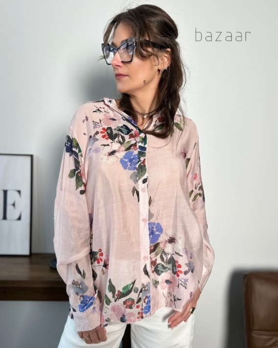Pozwól sobie na odrobinę romantyzmu z tą eteryczną koszulą, która zachwyca malarskim motywem kwiatów na pudrowo różówym tle. Wykonana ze szlachetnego połączenia bawełny i wiskozy, jest niezwykle delikatna, przewiewna i przyjazna dla ciała, gwarantując uczucie świeżości przez cały dzień. Jej lekka, subtelna struktura miękko opływa sylwetkę, nie krepując ruchów, a klasyczny krój z kołnierzykiem dodaje jej elegancji. To model, który wprowadzi wiosenny klimat do Twojej szafy, doskonale komponując się z białymi spodniami czy klasycznym denimem.