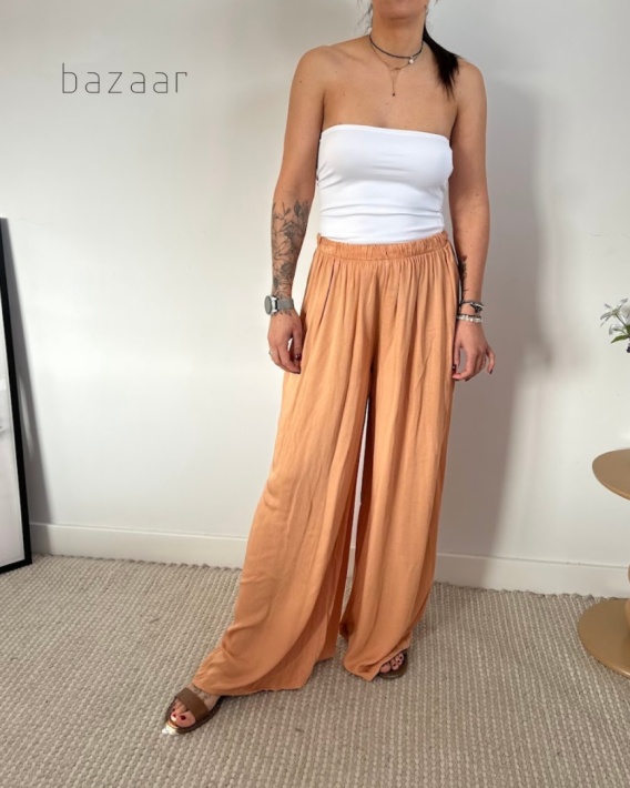 Poczuj letnią bryzę i nieograniczoną swobodę dzięki naszym nowym spodniom w orzeźwiającym odcieniu  patelowej pomarańczy Wykonane w 100% z niezwykle przewiewnej wiskozy, zmysłowo opływają sylwetkę, zapewniając uczucie przyjemnego chłodu i komfortu nawet w najcieplejsze dni. Fason palazzo z maksymalnie szeroką, lejącą się nogawką oraz elastyczną gumą w pasie gwarantuje idealne dopasowanie do każdej figury, dodając Twoim krokom wyjątkowej lekkości i gracji. To absolutny niezbędnik na wakacyjne wyjazdy i relaksujące spacery, który perfekcyjnie komponuje się z dopasowanymi topami i letnimi sandałkami.