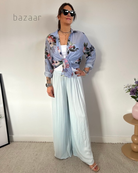 Poczuj letnią bryzę i nieograniczoną swobodę dzięki naszym nowym spodniom w orzeźwiającym odcieniu baby blue Wykonane w 100% z niezwykle przewiewnej wiskozy, zmysłowo opływają sylwetkę, zapewniając uczucie przyjemnego chłodu i komfortu nawet w najcieplejsze dni. Fason palazzo z maksymalnie szeroką, lejącą się nogawką oraz elastyczną gumą w pasie gwarantuje idealne dopasowanie do każdej figury, dodając Twoim krokom wyjątkowej lekkości i gracji. To absolutny niezbędnik na wakacyjne wyjazdy i relaksujące spacery, który perfekcyjnie komponuje się z dopasowanymi topami i letnimi sandałkami.