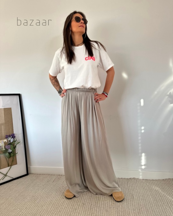 Poczuj letnią bryzę i nieograniczoną swobodę dzięki naszym nowym spodniom w kolorze fango /khaki Wykonane w 100% z niezwykle przewiewnej wiskozy, zmysłowo opływają sylwetkę, zapewniając uczucie przyjemnego chłodu i komfortu nawet w najcieplejsze dni. Fason palazzo z maksymalnie szeroką, lejącą się nogawką oraz elastyczną gumą w pasie gwarantuje idealne dopasowanie do każdej figury, dodając Twoim krokom wyjątkowej lekkości i gracji. To absolutny niezbędnik na wakacyjne wyjazdy i relaksujące spacery, który perfekcyjnie komponuje się z dopasowanymi topami i letnimi sandałkami.
