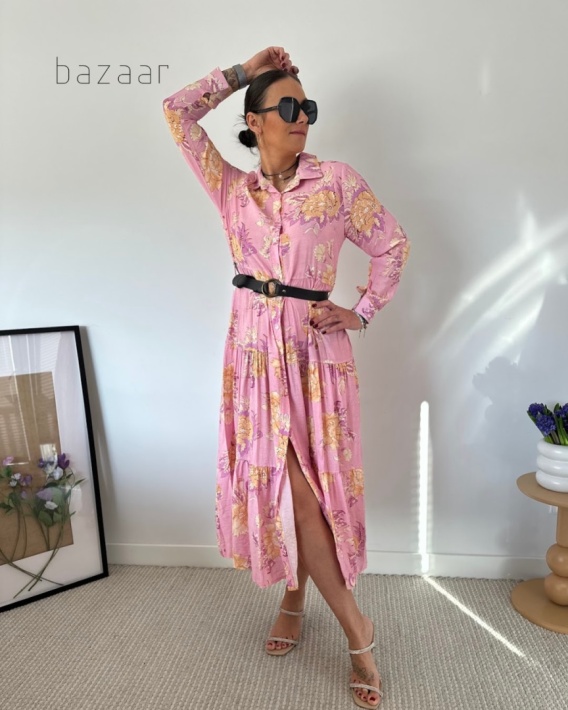 Poczuj powiew wiosennej świeżości i zjawiskową lekkość, wybierając naszą romantyczną sukienkę w urokliwym odcieniu różu, zdobioną bogatym, kwiatowym motywem. Uszyta z wysokiej jakości, oddychającej wiskozy z dodatkiem nylonu, jedwabiście opływa sylwetkę, zapewniając całodzienny komfort oraz idealne, zwiewne ułożenie materiału w ruchu. Koszulowa góra z klasycznym kołnierzykiem oraz rozkloszowany, kaskadowy dół z falbanami tworzą niezwykle kobiecą kompozycję, która subtelnie wysmukla figurę. To wszechstronna propozycja, w której poczujesz się wyjątkowo zarówno podczas letnich przyjęć, jak i podczas weekendowych spacerów.