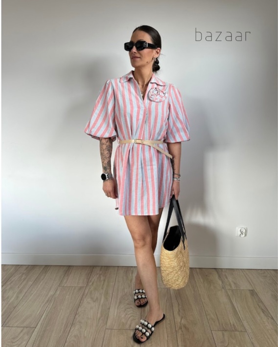 Poczuj letnią bryzę w tej niezwykle lekkiej i przewiewnej sukience koszulowej, która łączy w sobie klasyczny szyk z nutą romantyzmu. Wykonana z wysokiej jakości materiału w subtelne, niebiesko-różowe pasy, zapewnia wyjątkowy komfort noszenia nawet w najcieplejsze dni, pozostawiając skórę przyjemnie odświeżoną. Jej unikalny krój z efektownymi, bufiastymi rękawami o długości do łokcia dodaje sylwetce nowoczesnej objętości, a ozdobna aplikacja w kształcie róży przy dekolcie nadaje całości luksusowego charakteru.