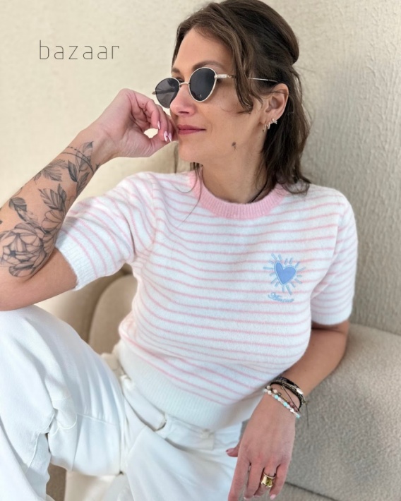 Wprowadź do swojej garderoby odrobinę słońca i beztroski dzięki temu uroczemu sweterkowi w paski. Wykonany ze szlachetnej mieszanki wiskozy i wełny, zachwyca niezwykłą miękkością i "pluszową" fakturą, która przyjemnie otula skórę, nie powodując gryzienia. Klasyczny fason z krótkim rękawem zyskał niepowtarzalny charakter dzięki pastelowym prążkom oraz słodkiemu detalowi w postaci haftowanego serduszka na piersi. Dostępny w trzech wersjach kolorystycznych – energetycznej żółci, romantycznym różu i świeżym błękicie – stanowi idealne uzupełnienie wiosennych stylizacji z białymi spodniami czy jeansami.